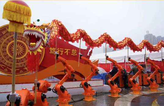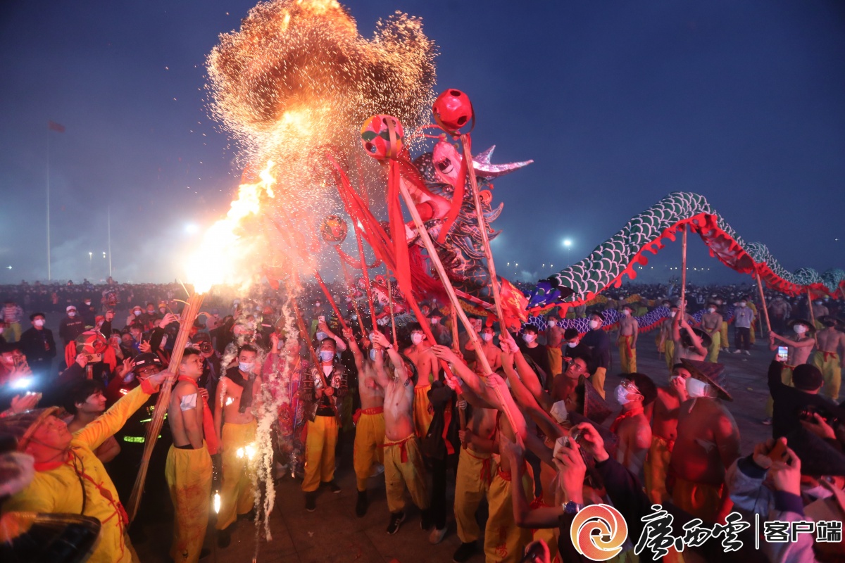 宾阳炮龙节。广西云-广西日报记者 徐天保 摄 今年的宾阳炮龙节,生猛劲儿更足,更有看头。 除了潮汕英歌队跨省助阵,还请来了一位特殊“舞龙手”——机械臂。钢铁之躯擎起竹木龙身,AI算法舞出千年古韵。当赛博朋克撞上传统民俗,有人问:这能搭吗?